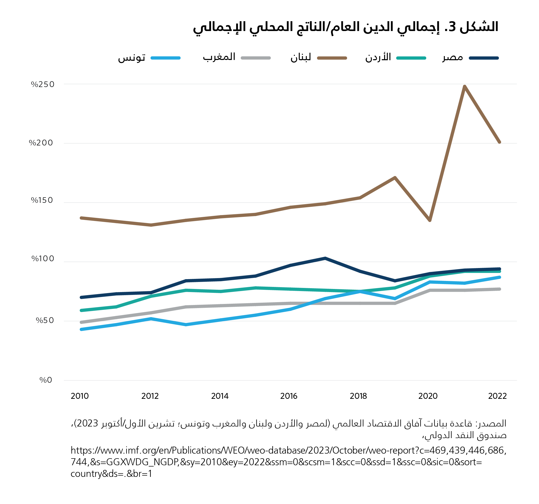 132 “Government Debt: Country Rankings,” Global Economy, https://www.theglobaleconomy.com/rankings/government_debt/MENA. تمّت زيارة الصفحة في 24 تموز/يوليو 2023،